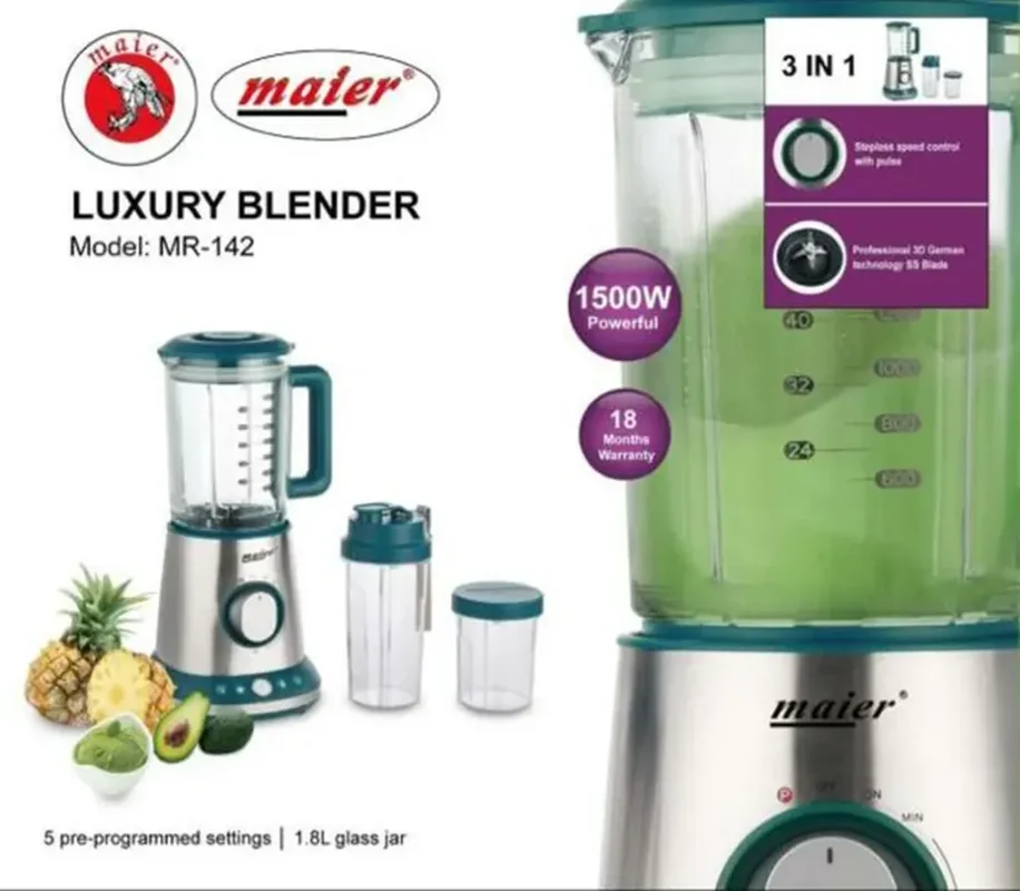 مخلوط کن 3 کاره مایر مدل MR-142 مدل 3 کاره با توان مصرفی 1500 وات، یکی از دستگاههای مخلوط کن موجود در بازار است. این دستگاه علاوه بر قابلیت مخلوط کردن، دارای دو ویژگی دیگر یعنی خرد کردن و پودر کردن مواد غذایی نیز میباشد. با داشتن تیغههای استیل ضد زنگ، این دستگاه قابلیت تهیه انواع مخلوطهای مختلف از جمله سس، کوکتل، شیک، نوشیدنیهای پروتئینی و … را داراست.