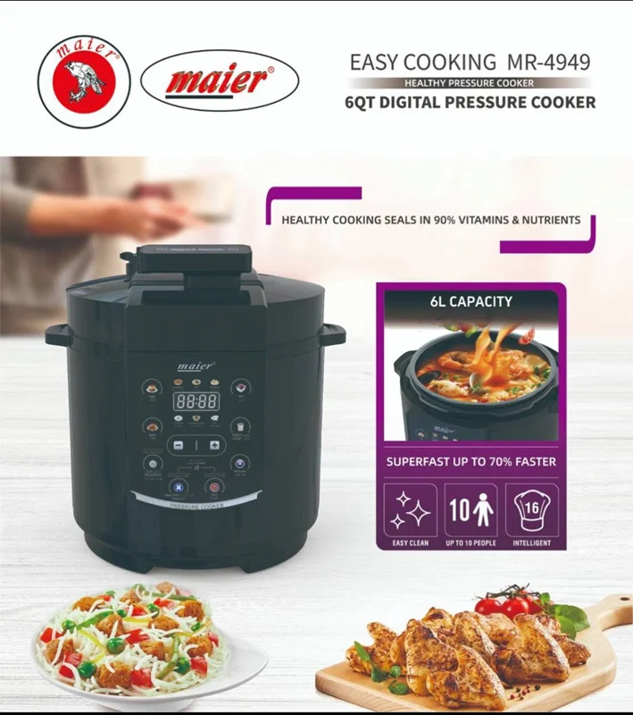 زودپز و پلوپز مایر مدل MR-4949، انتخابی ایدهآل برای آشپزخانه شما! با این محصول چندکاره، زمان پخت غذاهایتان را به نصف کاهش دهید و طعم لذیذتری تجربه کنید. ظرفیت بالا، طراحی شیک و عملکرد ایمن، این دستگاه را به دستیار همیشگی شما تبدیل میکند. فرصت را از دست ندهید و لذت آشپزی را با مایر تجربه کنید! زودپز و پلوپز مایر مدل MR-4949 دارای عملکرد پخت تاخیری،(DELAY TIMER) ، دارای صفحه نمایش LED و کنترل پنل لمسی است و همچنین دارای 12 منوی پخت خودکار و 24 عملکرد مختلف ،6 عملکرد ایمنی ،مجهز به دیگ 6 لیتری با پوشش نچسب ،قابلیت پخت برنج ،آبگوشت ،ته چین ،ته دیگ،خورشت،کیک،سوپ،حبوبات، گوشت ،ماست بند ، و دارای قابلیت تنظیم زمان دلخواه میباشد.